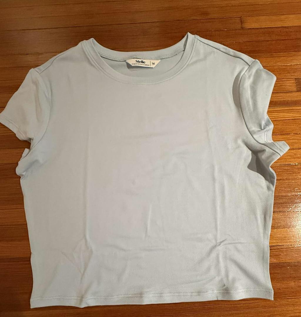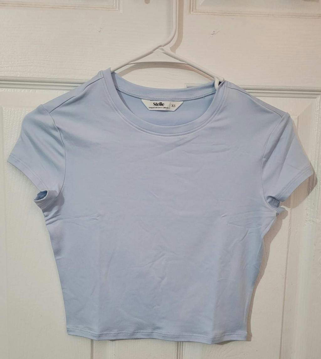 This is a great little cropped t-shirt. It reminds me of what we called a "baby tee" in the 90's and early aughts. I gave birth to 3 children, so my days of midriff bearing are over. I got this for my 16 year old daughter in size X-Small. It fits her great. It's really cute and sits just above her belly button. It is a pretty powder blue color. The fabric is really soft and has a little bit of stretch to it good quality. It came with a little note inside that said Better after washing, which is rarely the case. Too often, clothes don't look as good as they did brand new after washing.