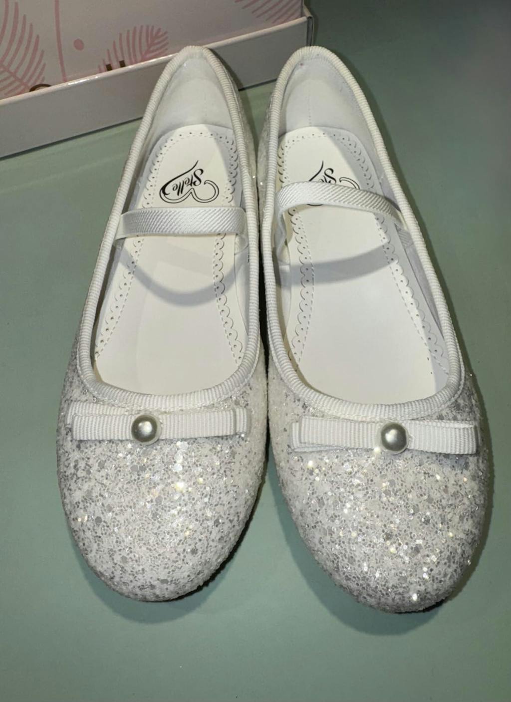 Girls Glitter Mary Jane Flats with Pearl Bows