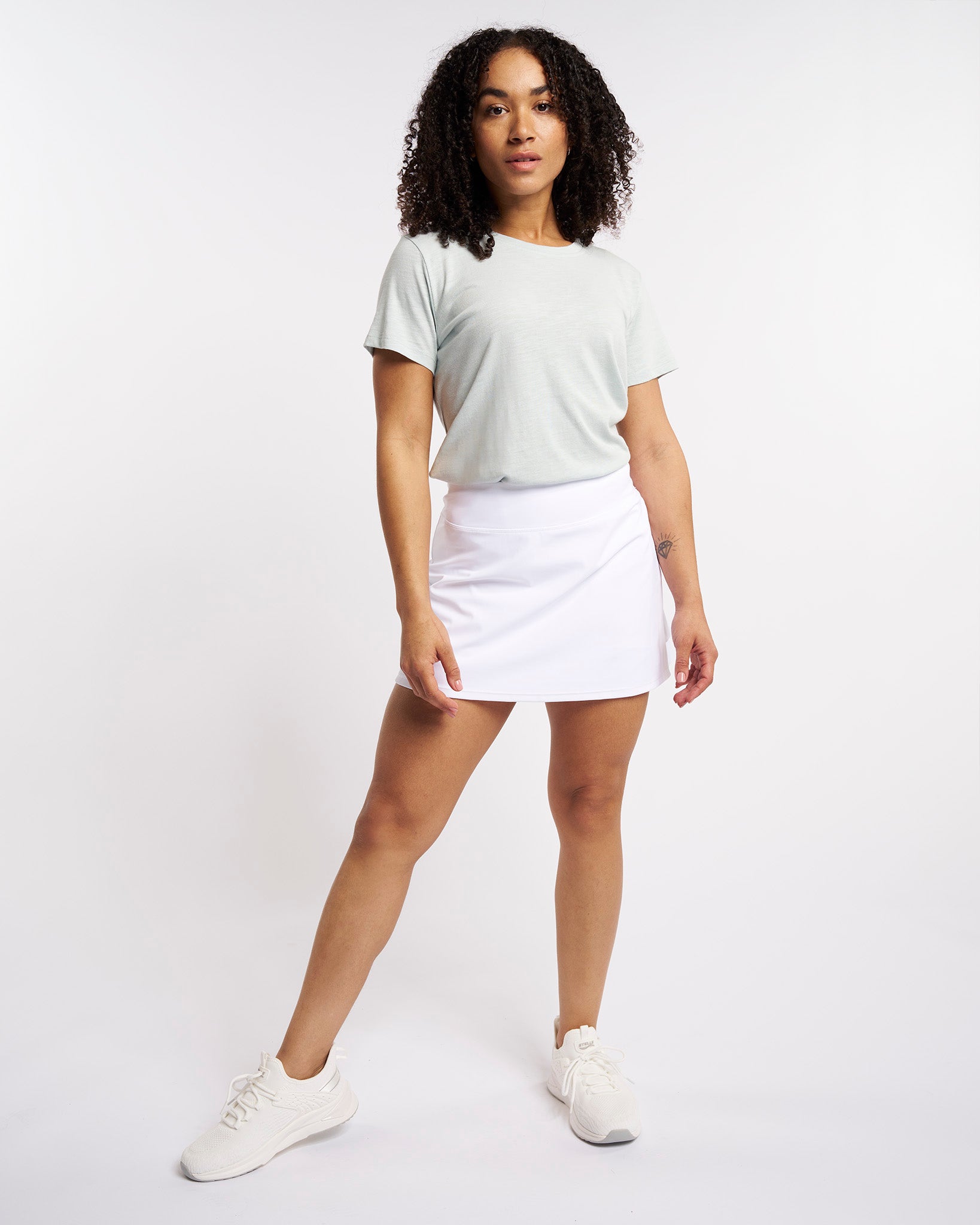Serve in more ways than one with our Women's Ruffle Ace Tennis Skirt. Smooth in the front with a flouncy double-ruffle hem in the back, this quick-dry style features a supportive high waist and built-in shorts with roomy pockets to help you play at the top of your game.