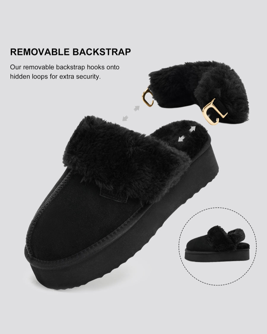 Removable Backstrap: Slip these fuzzy slippers on or secure them with a removable backstrap that attaches to hidden elastic for a custom fit.